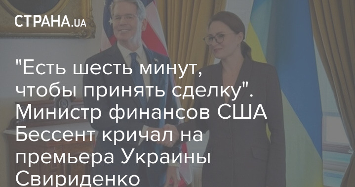 "Наприкінці лютого під час відеодзвінка міністр фінансів Скотт Бессент крикнув пані Свириденко, що має шість хвилин, щоб прийняти угоду, інакше переговори будуть закінчені", - пише газета.