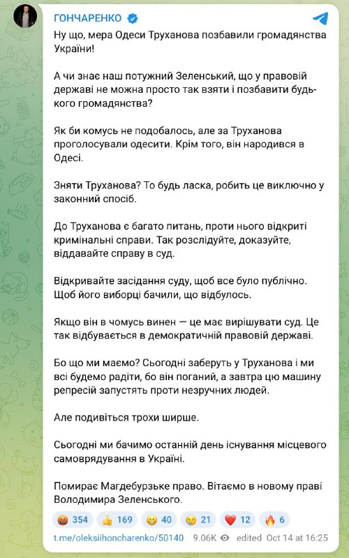 "У правовій державі не можна просто так взяти і позбавити когось громадянства. Як би комусь не подобалося, але за Труханова проголосували одесити. Крім того, він народився в Одесі. Якщо вже і знімати Труханова, то це потрібно робити виключно законним способом. суд. Сьогодні заберуть у Труханова і ми всі радітимемо, бо він поганий, а завтра машину репресій запустять проти незручних людей", - пише Гончаренко в Телеграмі.
