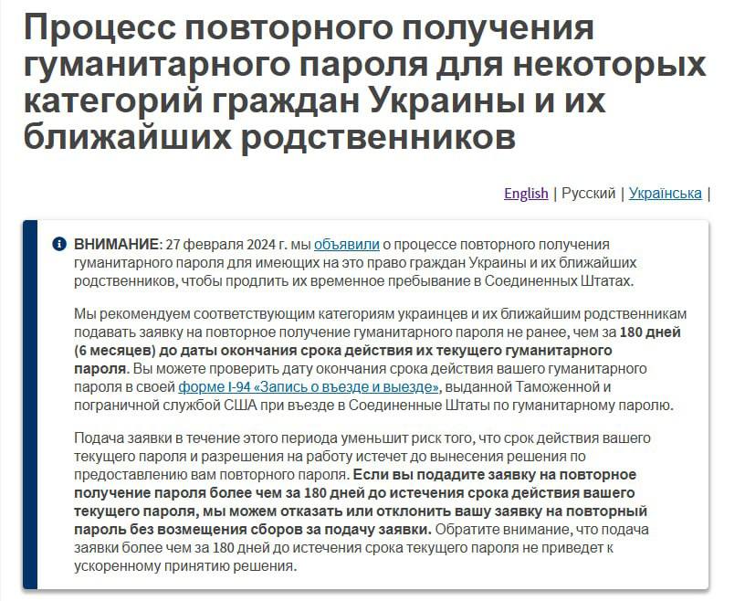 Для продовження parole, які закінчуються пізніше, влада США рекомендує подавати заявку не раніше, ніж за 180 днів до закінчення поточного parole.