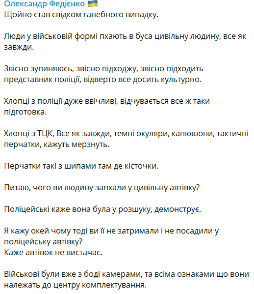 За словами нардепа, він став свідком примусової мобілізації: кілька людей в окулярах та капюшонах силою посадили чоловіка у цивільний автомобіль, при цьому на місці була поліція. Свій зовнішній вигляд співробітники ТЦК пояснили тим, що мерзнуть.