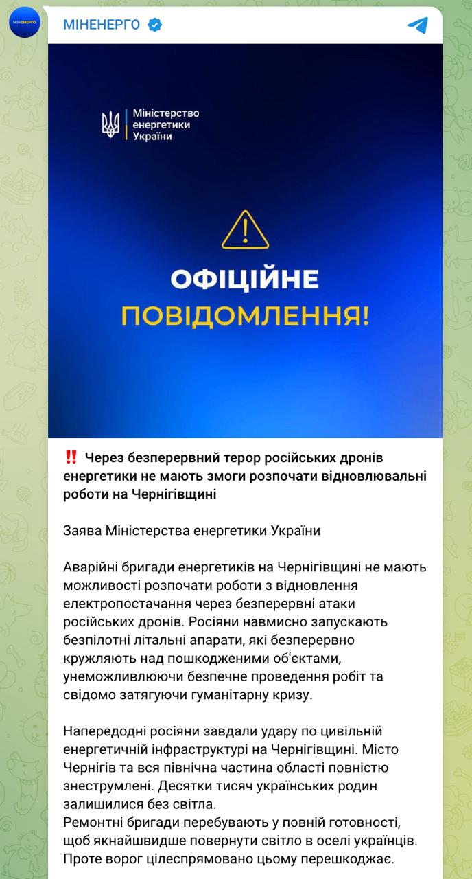 Тим часом у Міненерго заявляють, що блекаут у Чернігові та області затягується через те, що російські дрони заважають проведенню ремонтних робіт.