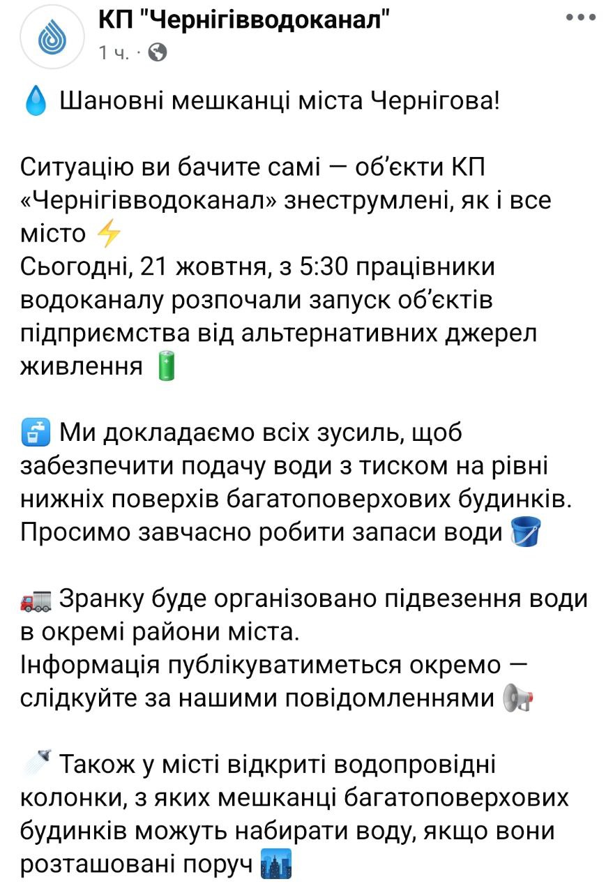 Внаслідок російських атак Чернігів повністю знеструмлений. Крім того, у місті немає водопостачання.