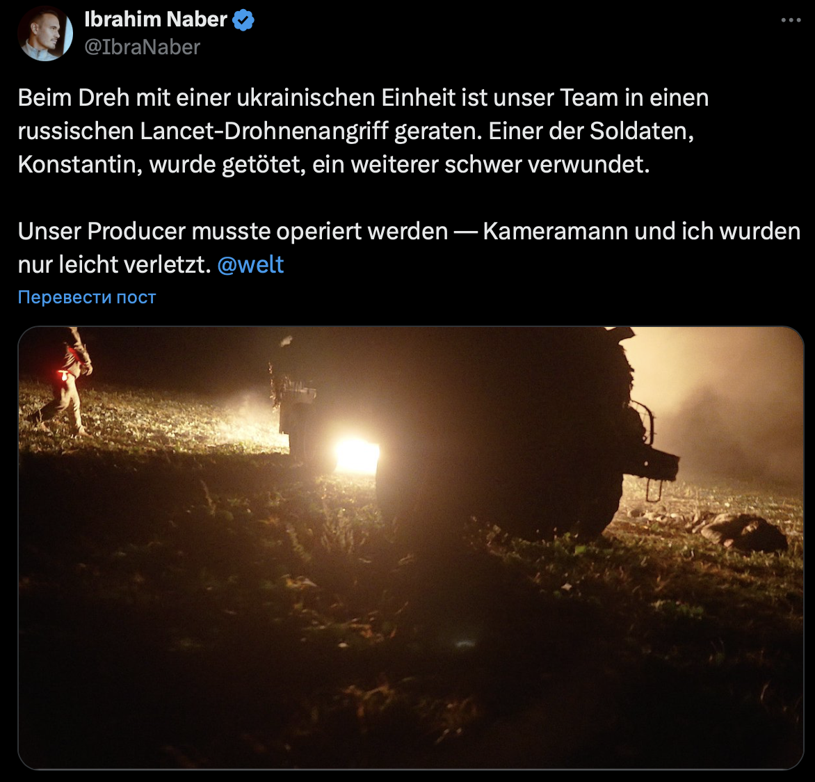 В Україні під час атаки російського безпілотника поранено шефа-репортера німецької газети Die Welt Ібрагіма Набера, який робив репортаж поблизу лінії фронту, супроводжуючи український підрозділ ППО.
