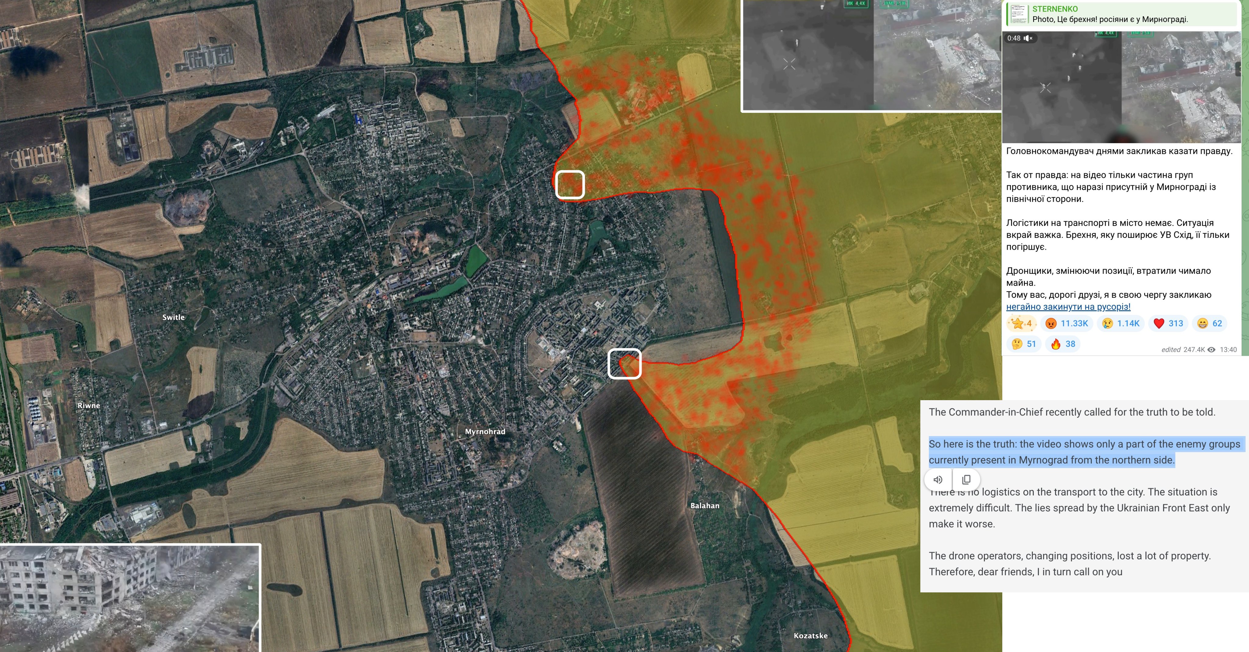 "Ситуація складна, але заяви російської пропаганди про нібито "блокування" Сил оборони України в Покровську, як і в Куп'янську, не відповідають дійсності. Разом з тим, у Покровську ворожа піхота, уникаючи бойових зіткнень, накопичується в міській забудові, змінює місця перебування, тому першочергово". головком.