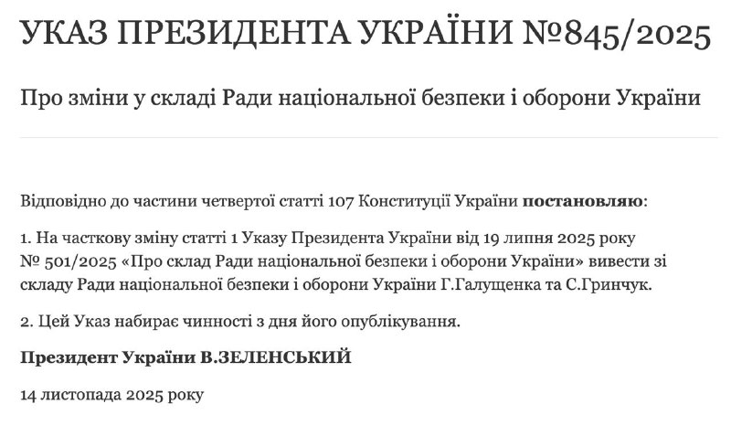 "Відповідно до частини четвертої статті 107 Конституції України ухвалюю: у рамках часткової зміни статті 1 указу президента України від 19 липня 2025 р. № 501/2025 "Про склад Ради національної безпеки і оборони України" вивести зі складу Ради національної безпеки і оборони України Г.Галущенка та С.Грінчук", - йдеться в указі.