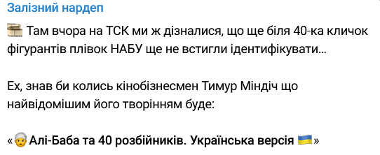 Нагадаємо, що Алі-Баба, за даними того ж Железняка, це голова Офісу президента Андрій Єрмак. Наразі пішли чутки про його швидку відставку у зв'язку з корупційним скандалом з Міндічем.
