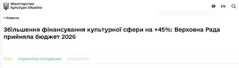 У статті видатків на культуру у державному бюджеті на 2026 рік закладено на 45% більше коштів, ніж у поточному році: 16,1 мільярда гривень.