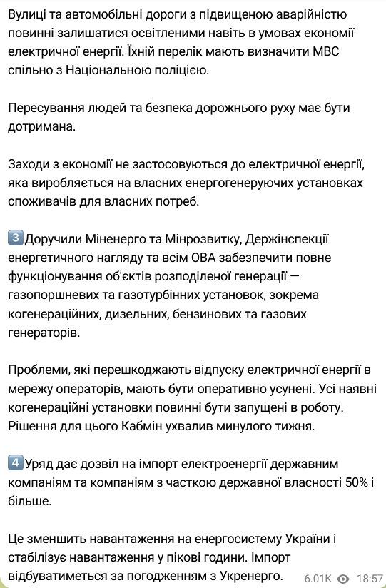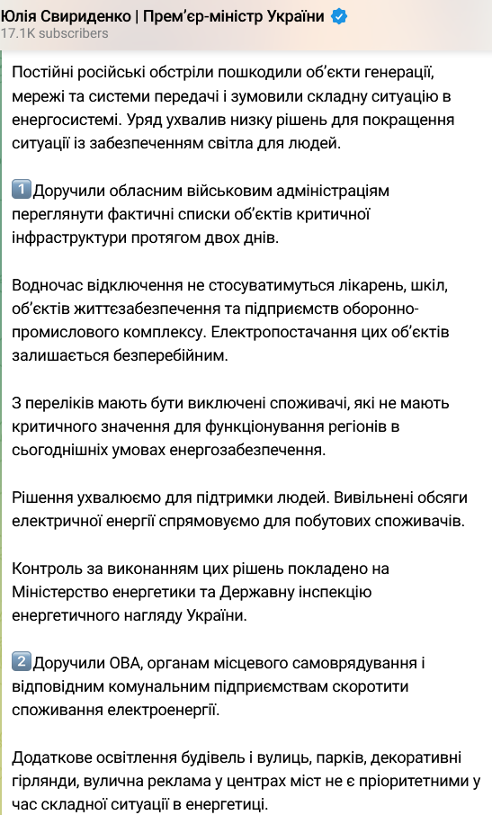 1. Виключення частини об'єктів зі списків критичної інфраструктури: ОВА мають за два дні оновити переліки та прибрати об'єкти, які не є справді важливими. Лікарні, школи, об'єкти життєзабезпечення та ВПК обіцяють не відключати.