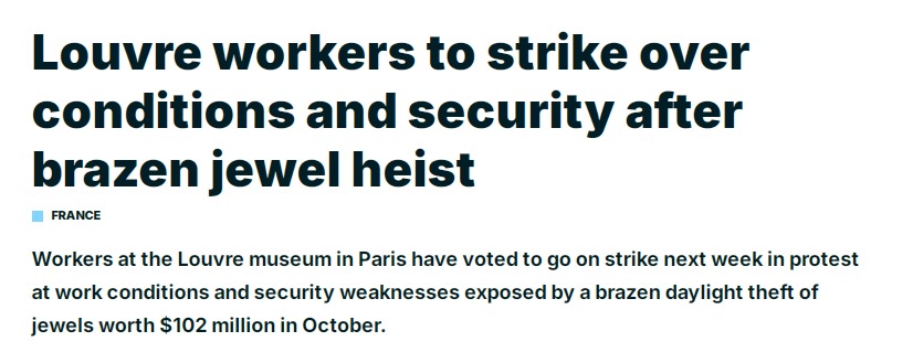 Працівники Лувру оголосили страйк через незадовільні умови праці та недоліки в системі безпеки після зухвалого пограбування музею в жовтні. Страйк розпочнеться у понеділок, 15 грудня.
