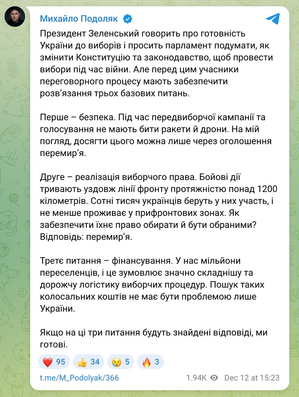 "Якщо на ці три питання буде знайдено відповіді, ми готові", - оголосив Подоляк.