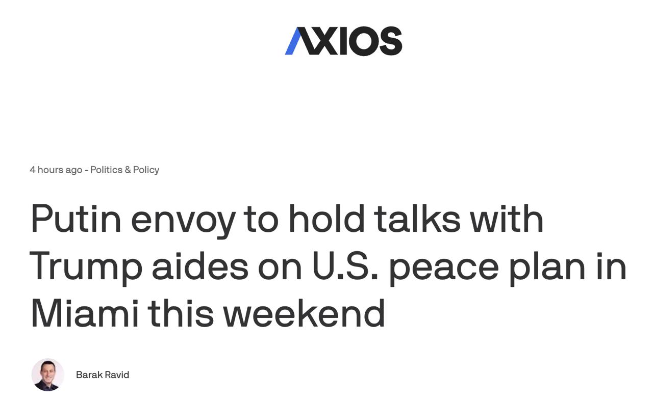 За словами представника Білого дому та знайомого із ситуацією джерела, спецпредставник президента Росії Кирил Дмитрієв відвідає Майамі у вихідні для переговорів зі спеціальним посланником Білого дому Стівеном Віткоффом та зятем Трампа Джаредом Кушнером, щоб обговорити план припинення війни в Україні. Як вважає Axios, на зустрічі з Дмитрієвим американська сторона намагатиметься переконати Москву погодитися з оновленим після переговорів із Києвом мирним планом про припинення війни.