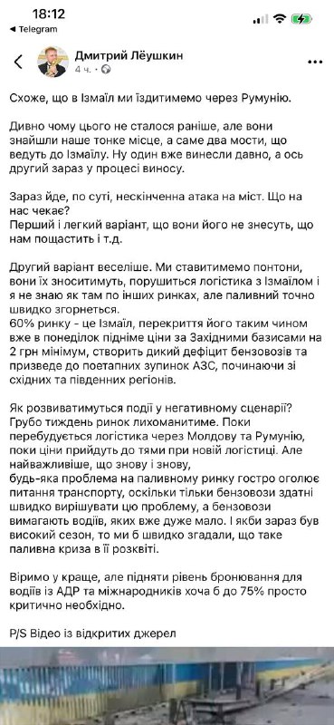 "Ми будемо ставити понтони, вони будуть їх зносити, порушиться логістика з Ізмаїлом і я не знаю як там по інших ринках, але паливний точно швидко згорнеться. 60% ринку - це Ізмаїл, перекриття його таким чином вже в понеділок підніме ціни по західних базисів на 2 грн мінімум, створить дикий дефіцит АЗС, починаючи зі східних та південних регіонів", – написав він.