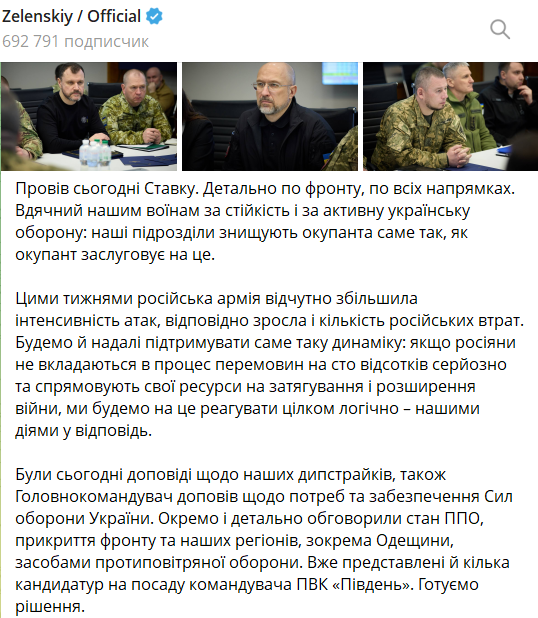 За словами президента, на ставці обговорили стан ППО, прикриття фронту та регіонів, зокрема, Одеської області. А також ситуацію на фронті, в армії та далекобійні удари по РФ.