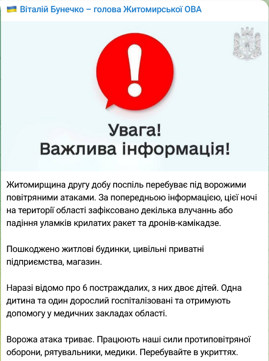 Тим часом у Житомирській області зафіксовано кілька попадань ракет та дронів. Про це повідомив голова ОВВ Віталій Бунечко.