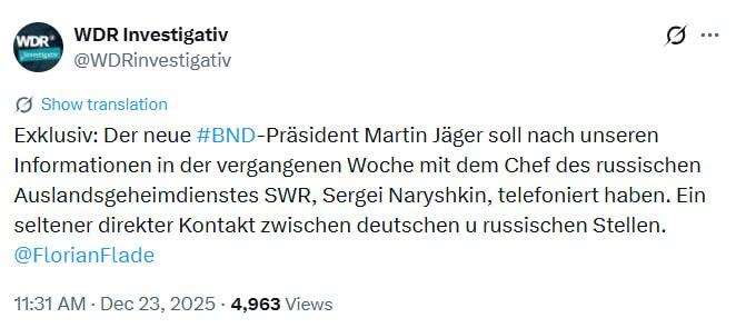 За інформацією телеканалу, телефонна розмова нового президента Федеральної розвідувальної служби Німеччини (BND) Єгера та голови Служби зовнішньої розвідки РФ Наришкіна - це "рідкісний випадок прямого контакту між німецькою та російською владою". Зміст розмови невідомий.