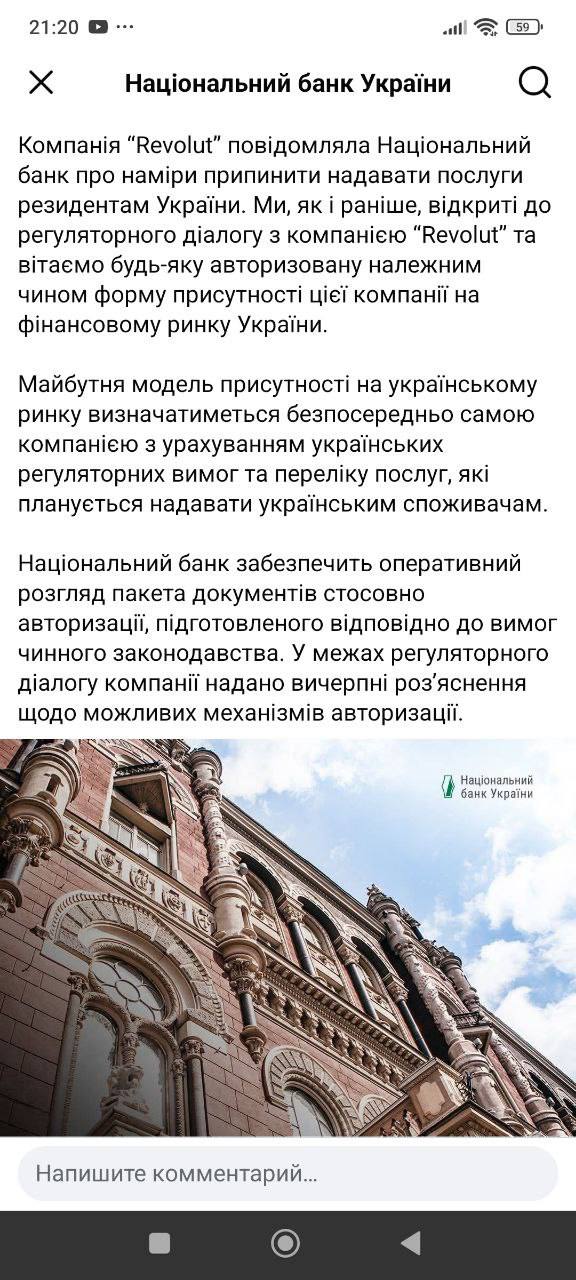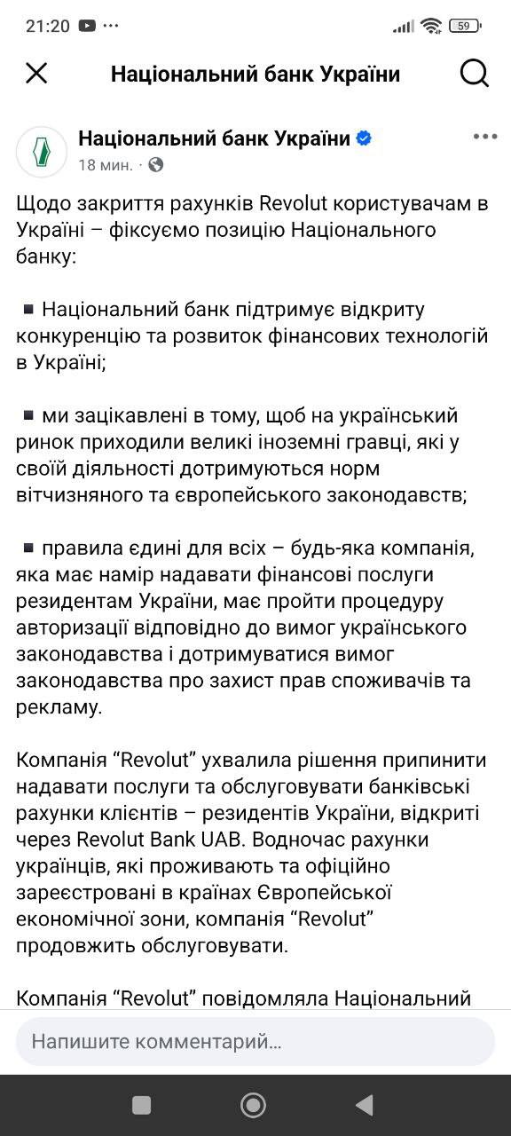 "Компанія Revolut прийняла рішення зупинити надання послуг та обслуговування банківських рахунків клієнтів - резидентів України, відкритих через Revolut Bank UAB. Водночас рахунки українців, які проживають та офіційно зареєстровані в країнах Європейської економічної зони, компанія Revolut продовжить обслуговувати", - наголошується в ньому.