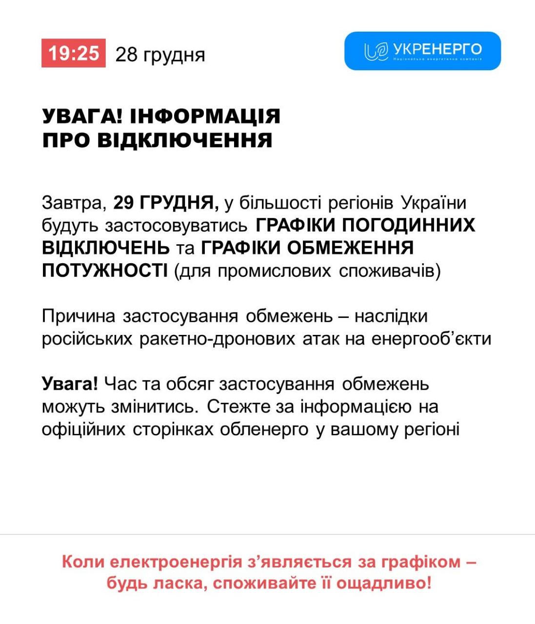 19:37 Завтра у більшості регіонів України діятимуть графіки відключень.