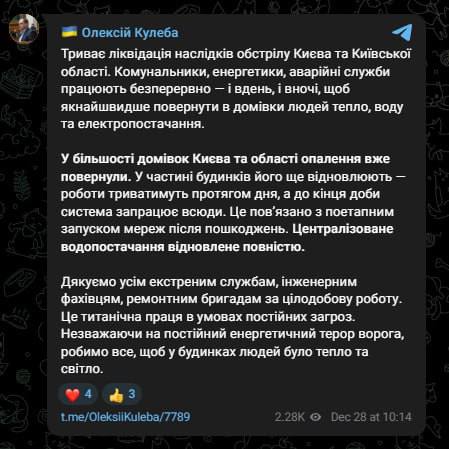 11:58 У Києві та області до кінця дня вже мають повернути опалення всім мешканцям, обіцяє віце-прем'єр Кулеба.