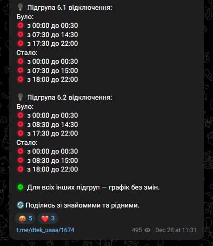 9:57 На правому березі Києва повернули графіки відключення світла. На лівому "ситуація складніша", і все ще діють екстрені відключення, повідомляє ДТЕК.