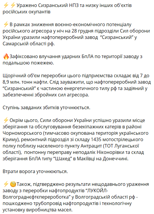 У ніч проти 28 грудня Сили оборони України вразили Сизранський нафтопереробний завод у Самарській області РФ.