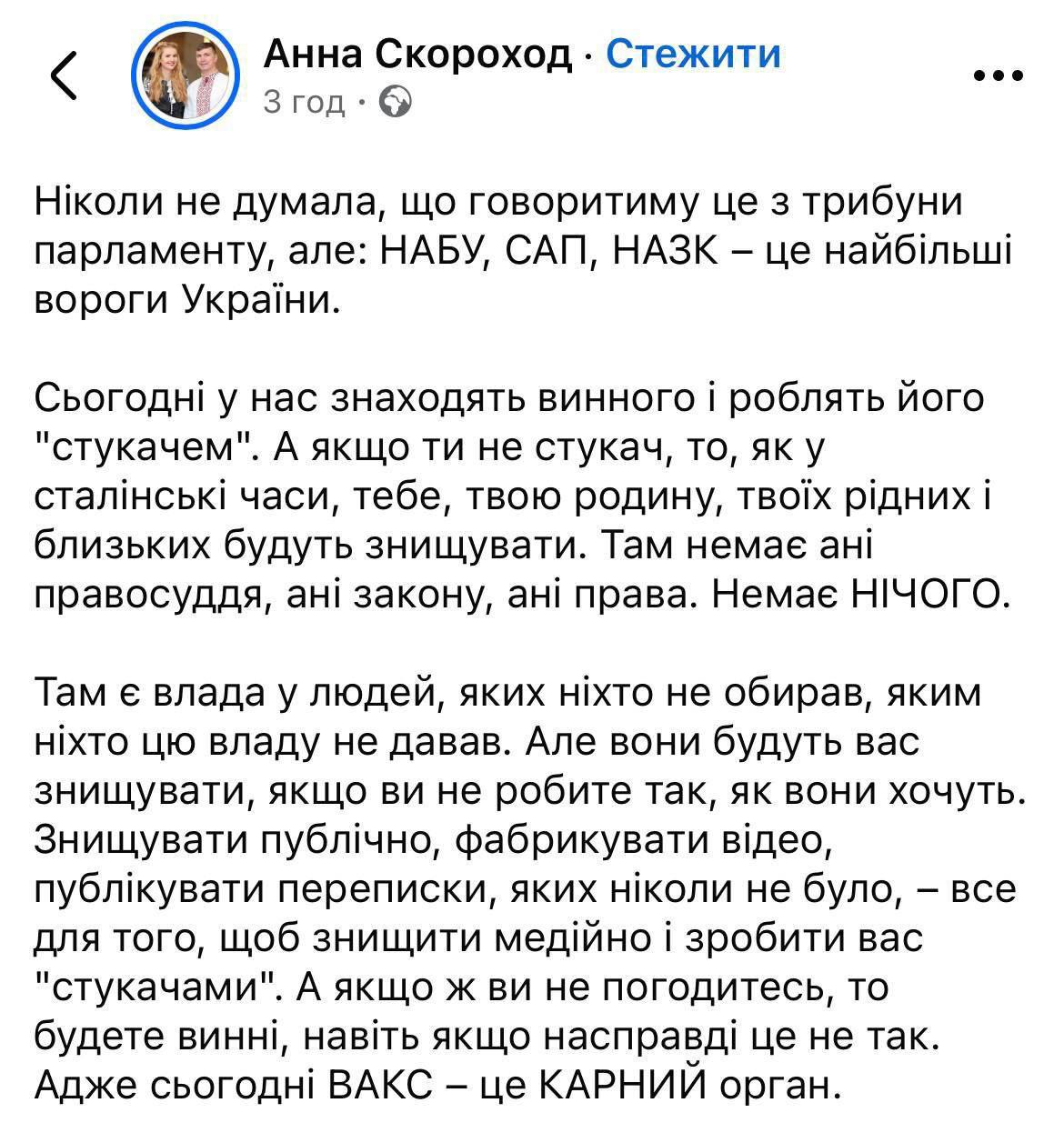 Народний депутат від партії "За майбутнє" Ганна Скороход, яка отримала підозру від Національного антикорупційного бюро, заявила, що цей та інші антикорупційні органи - Спеціалізована антикорупційна прокуратура, Національне агентство із запобігання корупції та Вищий антикорупційний суд - є "найбільшими ворогами".