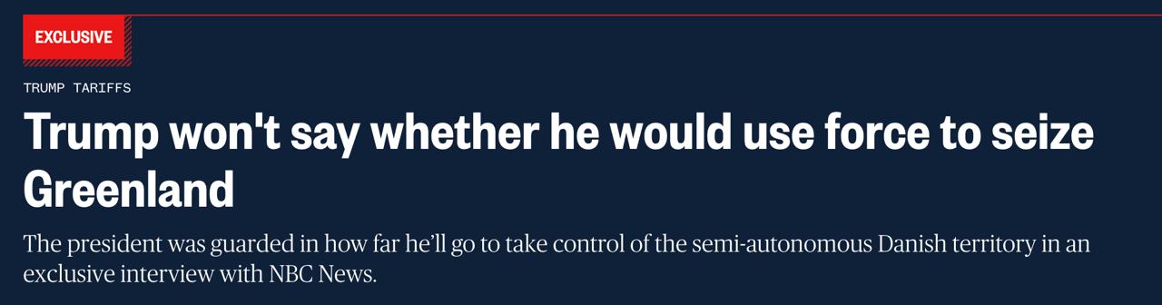 Президент США Дональд Трамп не став відповідати на запитання телеканалу NBC News, чи він готовий використати армію для захоплення Гренландії.
