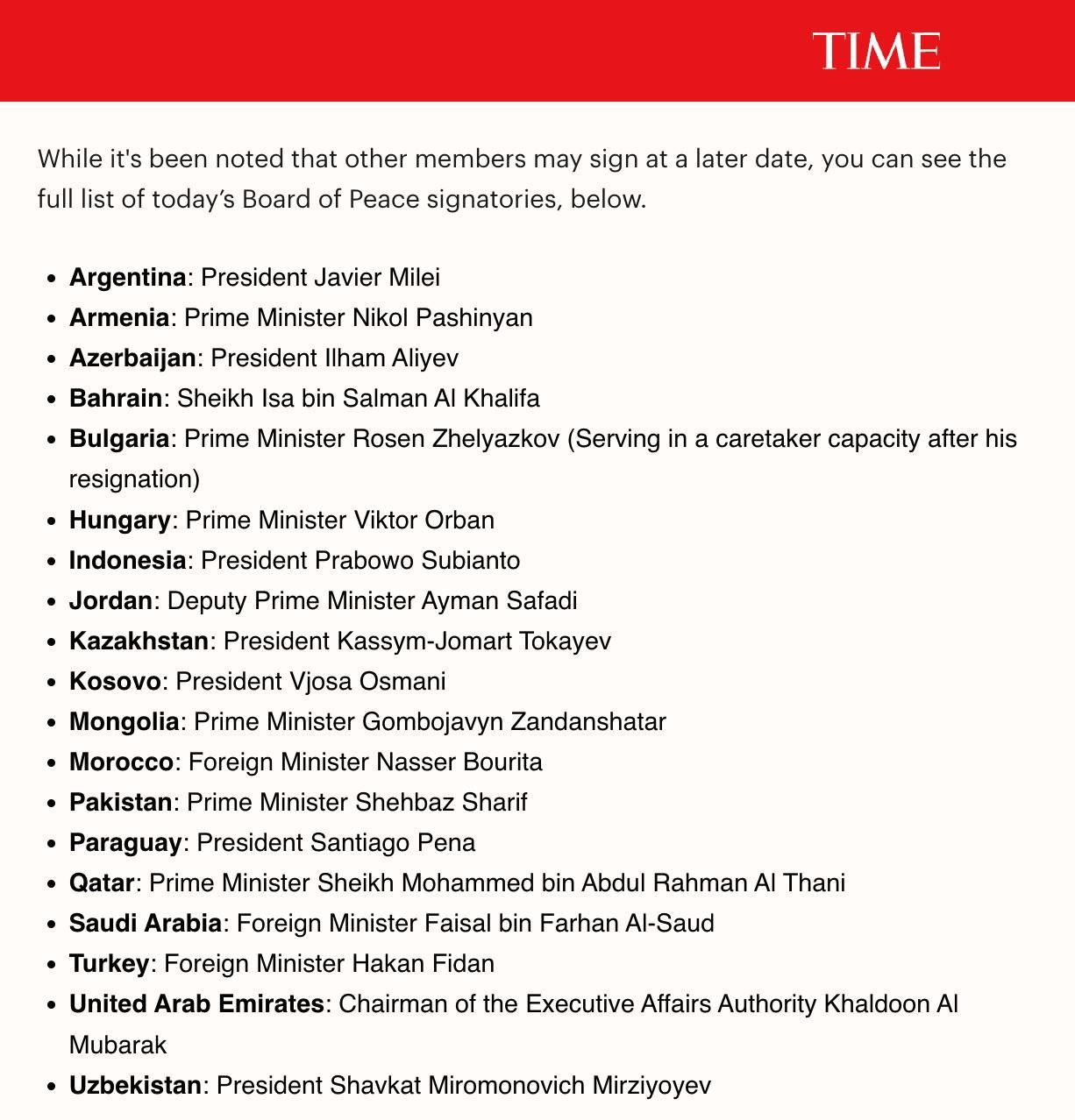 Телеканал NBC News у сьогоднішній статті повідомив, що згоду увійти до ради крім США, дали 24 країни: Албанія, Аргентина, Вірменія, Азербайджан, Бахрейн, Білорусь, Болгарія, Єгипет, Угорщина, Індонезія, Ізраїль, Йорданія, Казахстан, Косово, Монголія, Марокко, Пакистан, Параг, Об'єднані Арабські Емірати, Узбекистан та В'єтнам.