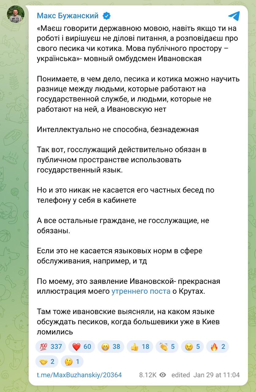 "Розумієте, в чому справа, песика та котика можна навчити різниці між людьми, які працюють на державній службі, та людьми, які не працюють на ній, а Івановську ні", - написав Бужанський у своєму телеграм-каналі.