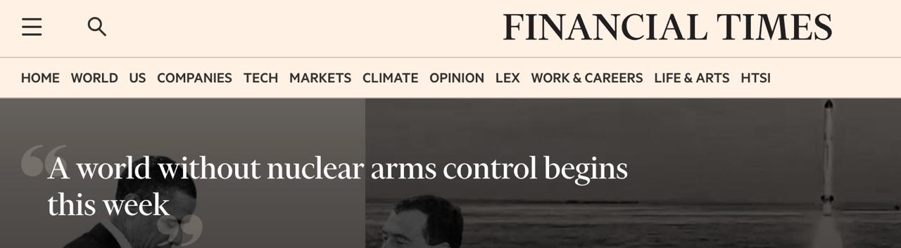 Видання нагадало про пропозицію президента РФ Володимира Путіна, щоб США і Росія добровільно продовжували дотримуватися чинних обмежень після закінчення терміну договору про заходи щодо подальшого скорочення та обмеження стратегічних наступальних озброєнь (СНО-3). Трамп назвав це "гарною ідеєю", але так і не дав офіційної відповіді. Він лише заявив, що віддав би перевагу "новій, набагато вигіднішій угоді" з Росією та Китаєм. На думку FT, Трамп ще може оголосити в останню хвилину, що має намір ухвалити пропозицію Путіна.