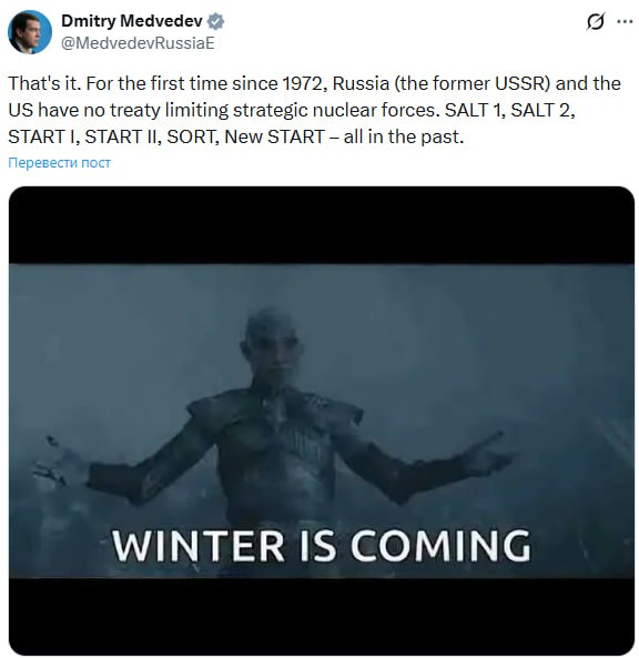 До своєї посади Медведєв додав мем із серіалу "Гра престолів" з підписом "Зима близько".
