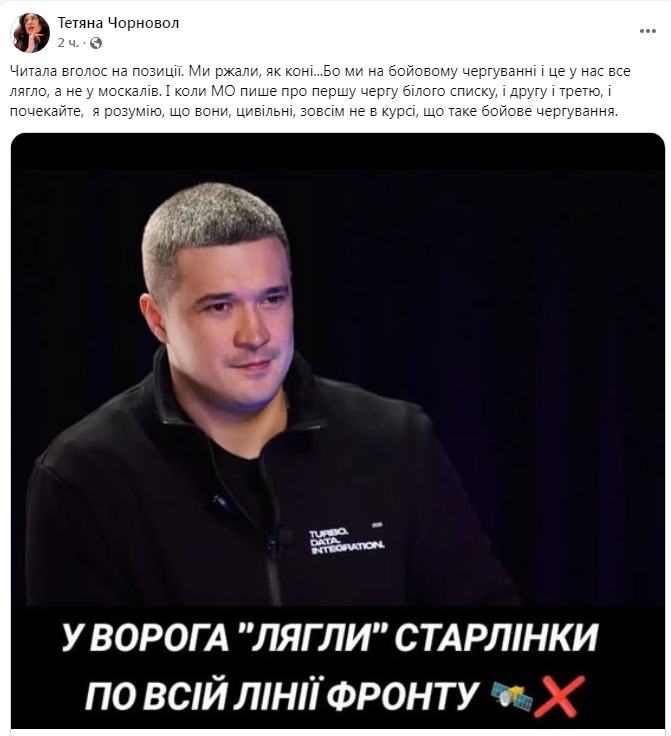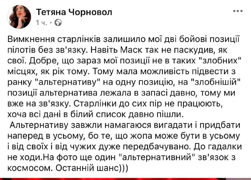"Вимкнення "Старлінків" залишило мої дві бойові позиції пілотів без зв'язку. Навіть Маск так не гадив, як свої. Добре, що зараз мої позиції не в таких "злісних" місцях, як рік тому. всі дані до білого списку давно пішли", - розповіла Чорновіл.
