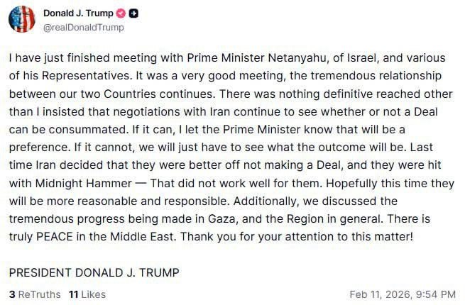 "Я щойно завершив зустріч з прем'єр-міністром Ізраїлю Біньяміном Нетаньяху і низкою його представників. Це була дуже хороша зустріч, наші дві країни продовжують підтримувати виключно тісні відносини. Жодних остаточних домовленостей досягнуто не було, за винятком того, що я наполягав на продовженні переговорів з Іраном. Вдасться, я повідомив прем'єр-міністру, що це буде переважним варіантом.