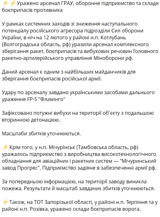 Сили оборони України в ніч на 12 лютого в районі населеного пункту Котлубань у Волгоградській області вразили арсенал комплексного зберігання ракет, боєприпасів та вибухових речовин Головного управління Міноборони РФ.