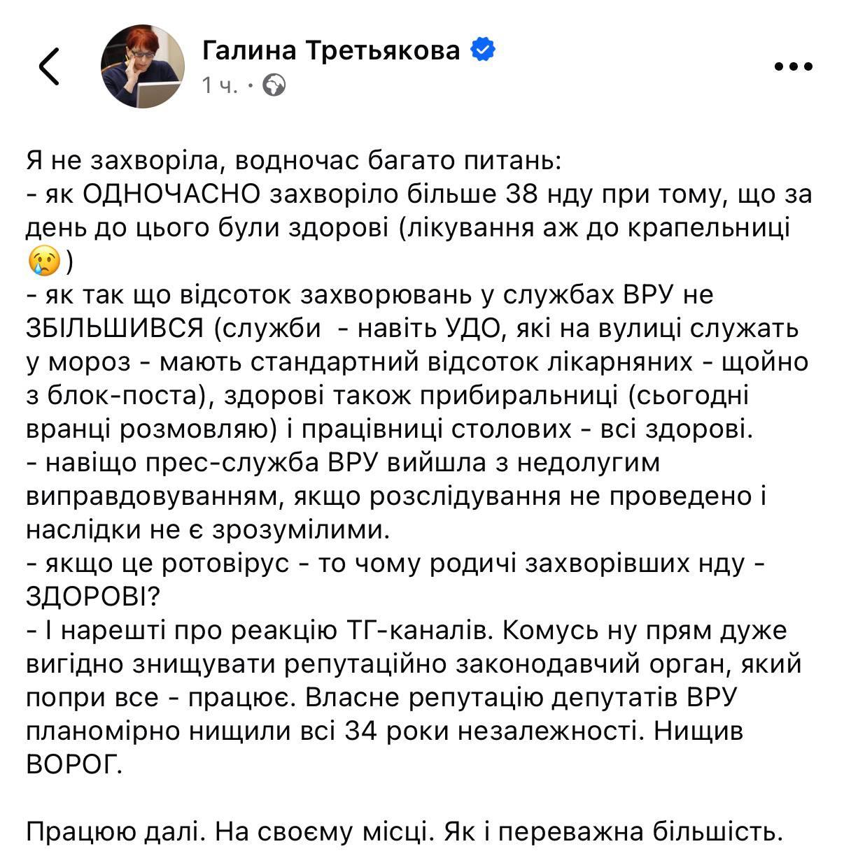 "Я не захворіла, проте є багато питань: як одночасно захворіло понад 38 народних депутатів України, причому напередодні вони були здорові (лікування аж до крапельниці); як так, що відсоток захворювань у службах ВРУ не збільшився (служби – навіть УДВ, які несуть службу на вулиці на морозі, – мають стандартний відсоток лікарняних, щойно з блокпоста); здорові також прибиральниці (сьогодні вранці розмовляла) та робітниці їдалень - усі здорові. Навіщо прес-служба ВРУ вийшла з невдалим виправданням, якщо розслідування не проведено та наслідки не зрозумілі? Якщо це ротавірус – то чому родичі хворих нардепів здорові? І нарешті, про реакцію телеграм-каналів. Комусь дуже вигідно руйнувати репутаційно-законодавчий орган, який, незважаючи ні на що, працює. Власне, репутацію депутатів ВРУ планомірно знищували усі 34 роки незалежності. Знищував ворог. Працюю далі. На своєму місці. Як і переважна більшість", - написала нардеп на своїй сторінці у Facebook.