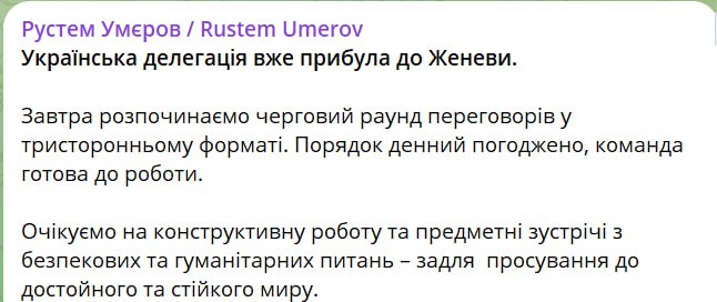 Про це повідомив голова делегації України, секретар Ради національної безпеки та оборони (РНБО) Рустем Умеров у своєму телеграм-каналі.