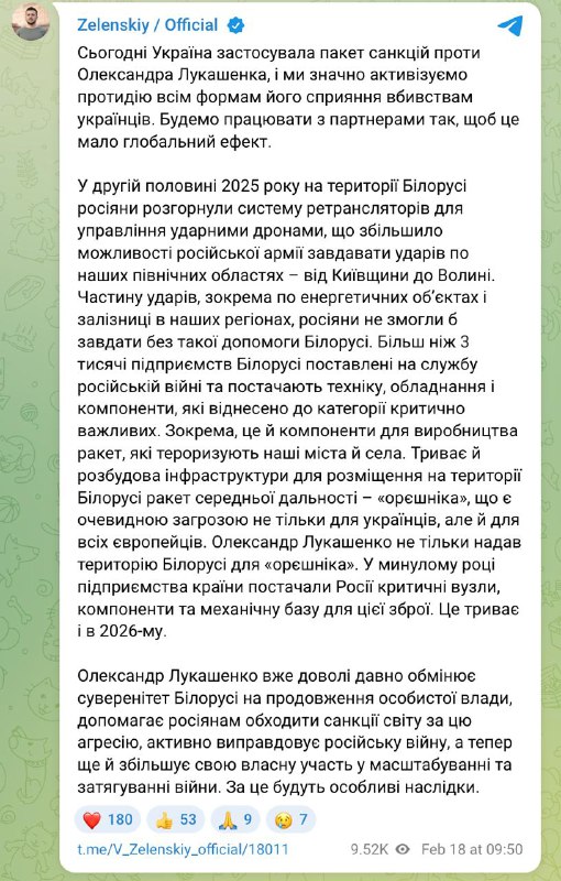 "Олександр Лукашенко вже давно обмінює суверенітет Білорусі на продовження особистої влади, допомагає росіянам обходити санкції світу за цю агресію, активно виправдовує російську війну, а тепер ще й збільшує свою участь у масштабуванні та затягуванні війни. За це будуть особливі наслідки", - попередив президент України.