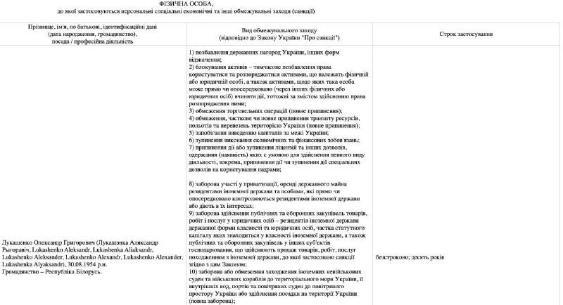 Санкції проти Лукашенка передбачають блокування активів, припинення торгівлі та транзиту, заборону фінансових операцій, участь у приватизації та оренді державної власності, держзакупівлі, оборонні закупівлі, операції з цінними паперами, передачу технологій, в'їзду в Україну, а також заходи суден до українських портів.