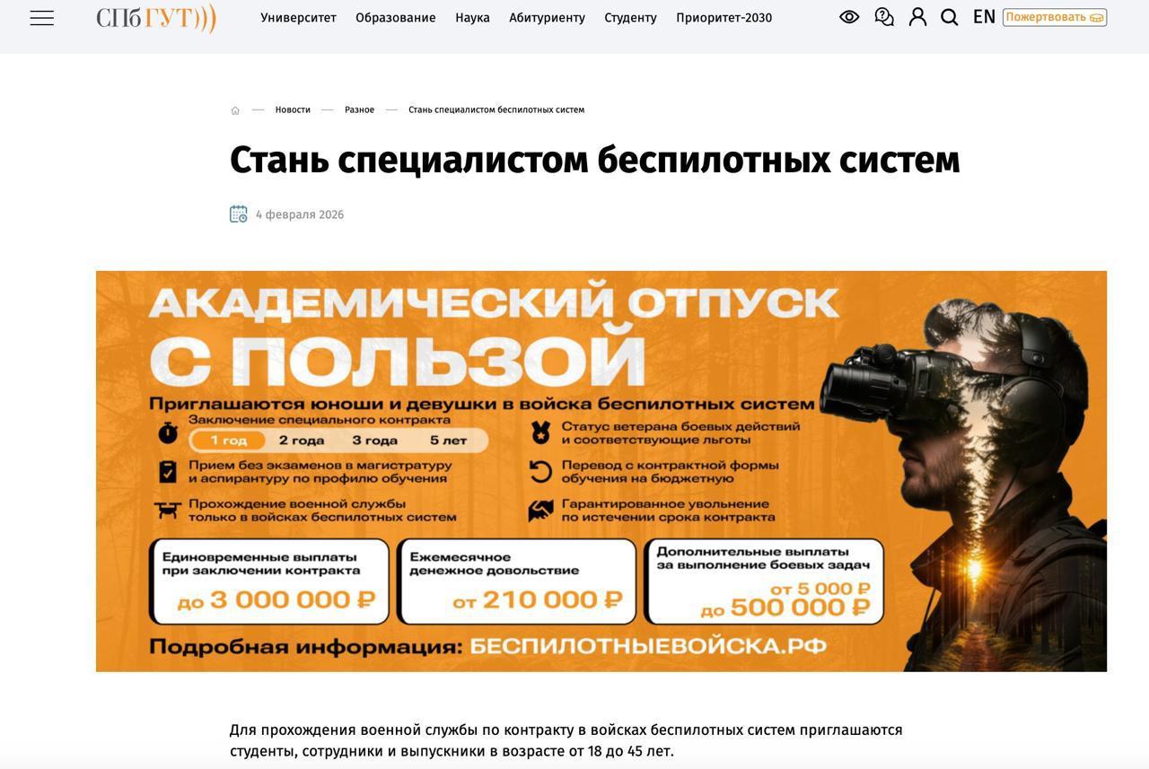 Петербурзьких студентів та викладачів вищих навчальних закладів запрошують вступити до нових військ безпілотних систем армії РФ. Натомість їм обіцяють всілякі пільги та статус ветерана.