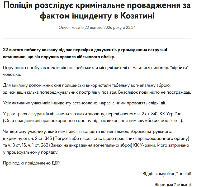 "22 лютого біля вокзалу під час перевірки документів у громадянина патрульні встановили, що він порушив правила військового обліку. Порушник спробував втекти від поліцейських, а місцеві жителі намагалися силою відбити чоловіка. Для виклику допоміжних сил поліцейські використовували табельну вогнепальну зброю. постраждав", - повідомили у поліції.