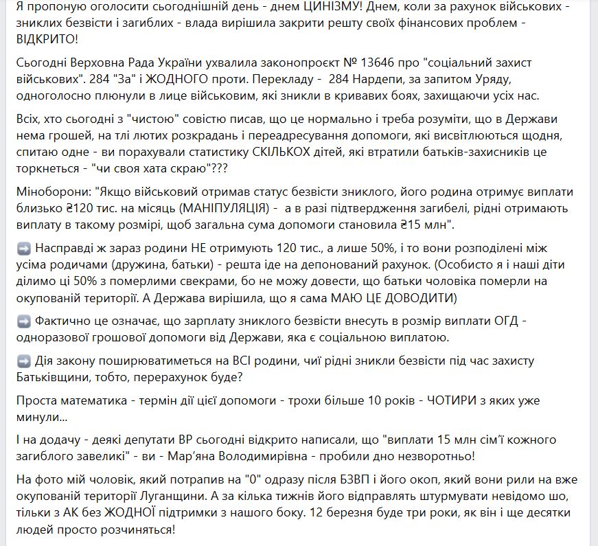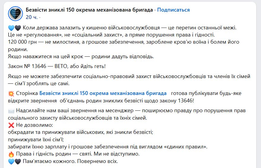 Був закон. Були чіткі умови. Були гарантії сім'ям військовослужбовців. І в момент, коли тисячі сімей вже живуть у невизначеності, ці правила просто змінюють – в односторонньому порядку. Статус сім'ї безвісти зниклого – це не тимчасова історія. Це не “до з'ясування”. Це не пауза на кілька місяців. знать. А государство говорит нам: ждите. Ждите подтверждений. Ждите обмена. Ждите результатов. Хорошо. Но если вы говорите нам ждать, нельзя одновременно урезать те гарантии, которые были даны семьям. Нельзя забирать денежное обеспечение военнослужащего и единовременную помощь, чтобы "оптимизировать бюджет". Это не про экономию. Это про мораль", – говорится в заявлении группы без вести зниклих 150-ї механізованої бригади.