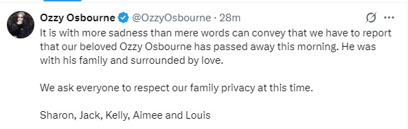 "З сумом, який неможливо висловити словами, ми змушені повідомити, що сьогодні вранці пішов із життя наш улюблений Оззі Осборн. Він був зі своєю родиною та оточений любов'ю", - йдеться у заяві сім'ї.