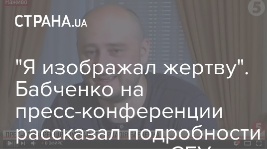 "Во вторник, в 6 вечера, ко мне приехал гример. Мы тренировались. Он мне показывал, как падает убитый человек, как у него идет кровь на пробитом легком. Футболку мою отвезли на отдельный манекен и прострелили. Кровь была настоящая, свиная. Сгустки крови насовали в дырки от пуль. Потом все ушли, мы остались одни, жена позвонила в полицию". Бабченко говорит, что приехавшая полиция была не в курсе спецоперации. "Легенда была в том, что я еще живой", - рассказал Бабченко.