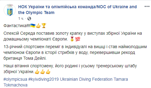 "Алексей Середа поставил золотую точку в выступлениях сборной Украины на домашнем чемпионате Европы. 13-летний спортсмен победил в индивидуале на вышке и стал самым молодым чемпионом Европы в истории прыжков в воду, превзойдя рекорд британца Тома Дэйли. Наши поздравления спортсмену, его семье и всему тренерскому штабу сборной Украины", - говорится в сообщении.