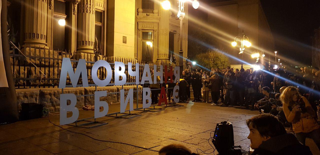 Также на экране транслировался небольшой ролик - хронология события происшествия с Катей Гандзюк. В то же время рядом с экраном установили металлическую конструкцию с надписью "Молчание убивает". Под металлоконструкцией "Молчание убивает" участники акции "Год без Кати" установили памятные лампады.