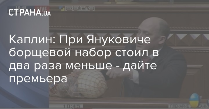 Народный депутат Сергей Каплин пришел в Раду с сеткой борщевого набора. Он заявил, что борщевой набор при Януковиче стоил в два раза меньше. "Хоть с чертом лысым объединяйтесь, дайте завтра стране премьера", - заявил нардеп.